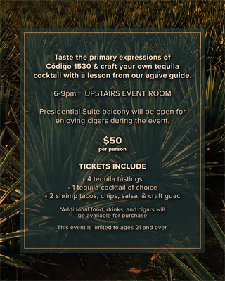 Taste of Código will take place in the upstairs event room with doors opening at 5:30pm and the tasting presentation starting shortly after 6pm. We will have rows of tables that will be open seating and have chips & salsa available to start. Shortly after the host begins our Código journey, your shrimp tacos & craft guacamole will be brought out to you to enjoy throughout the tasting. Our agave guide will introduce each expression along with the history of the tequilas and what sets Código 1530 apart from the rest as a one of a kind distillery. Keep a sharp eye - prizes will be handed out if you answer a surprise question correctly!